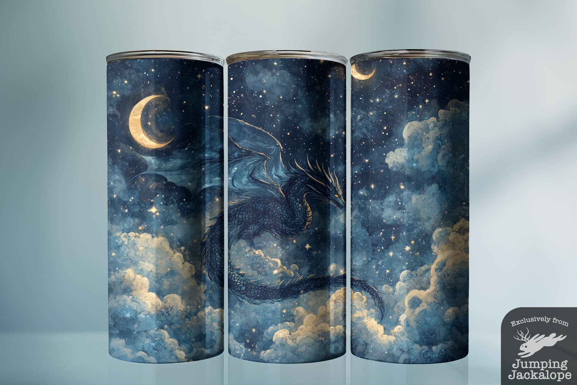 An elegant dragon emerges from a sea of stars in this ethereal 20oz tumbler. Painted in rich sapphire tones with radiant moons and swirling mist, the design evokes a storybook legend come to life.